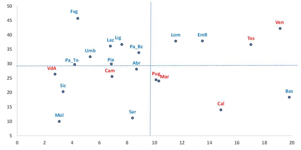 Figura 1 – Ritardo nel completamento nell’esecuzione dei progetti Pnrr (ascisse) e pagamenti (ordinate) al 30 giugno 2025 per regione (valori percentuali)