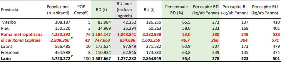 La produzione di rifiuti urbani rimane elevata, con circa 501 chilogrammi per abitante (dettagli e ripartizione provinciale in Tavola 1), mentre la Capitale continua a rappresentare il nodo più critico del sistema.