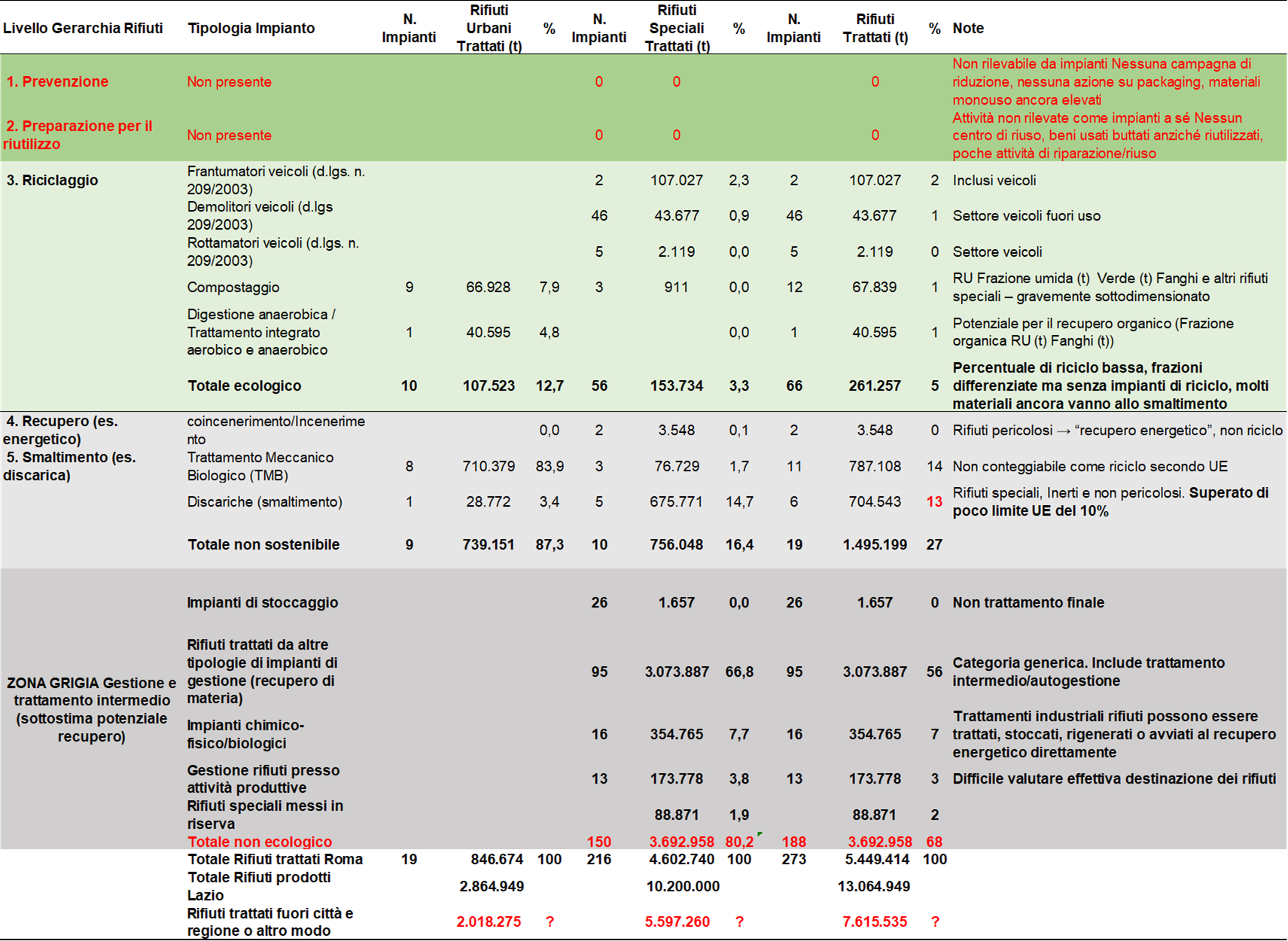 Le motivazioni del fallimento del sistema sono l’assenza dei livelli 1 e 2 della gerarchia (prevenzione, riuso); riciclo effettivo bassissimo (6,7%); dipendenza da discariche e impianti fuori Regione; Zona grigia enorme (80%); Impianti dell’organico insufficienti; mancanza quasi totale di filiere del riciclo a Roma.