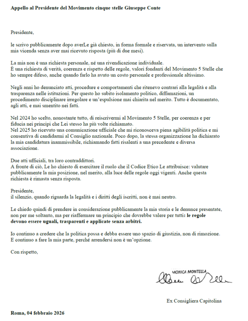 Per questo, il 17 novembre 2025, nel rispetto di un principio in cui credo profondamente – una donna non si deve arrendere mai – ho chiesto formalmente un intervento del Presidente Giuseppe Conte, come previsto dal Codice Etico.