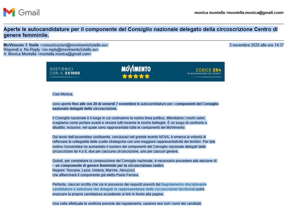 Il 3 novembre 2025 ho ricevuto una comunicazione ufficiale che mi consentiva di presentare la mia autocandidatura per il componente del Consiglio nazionale, come delegata della circoscrizione Centro – genere femminile. Un messaggio formale che riconosceva la mia piena agibilità politica e il possesso dei requisiti richiesti.