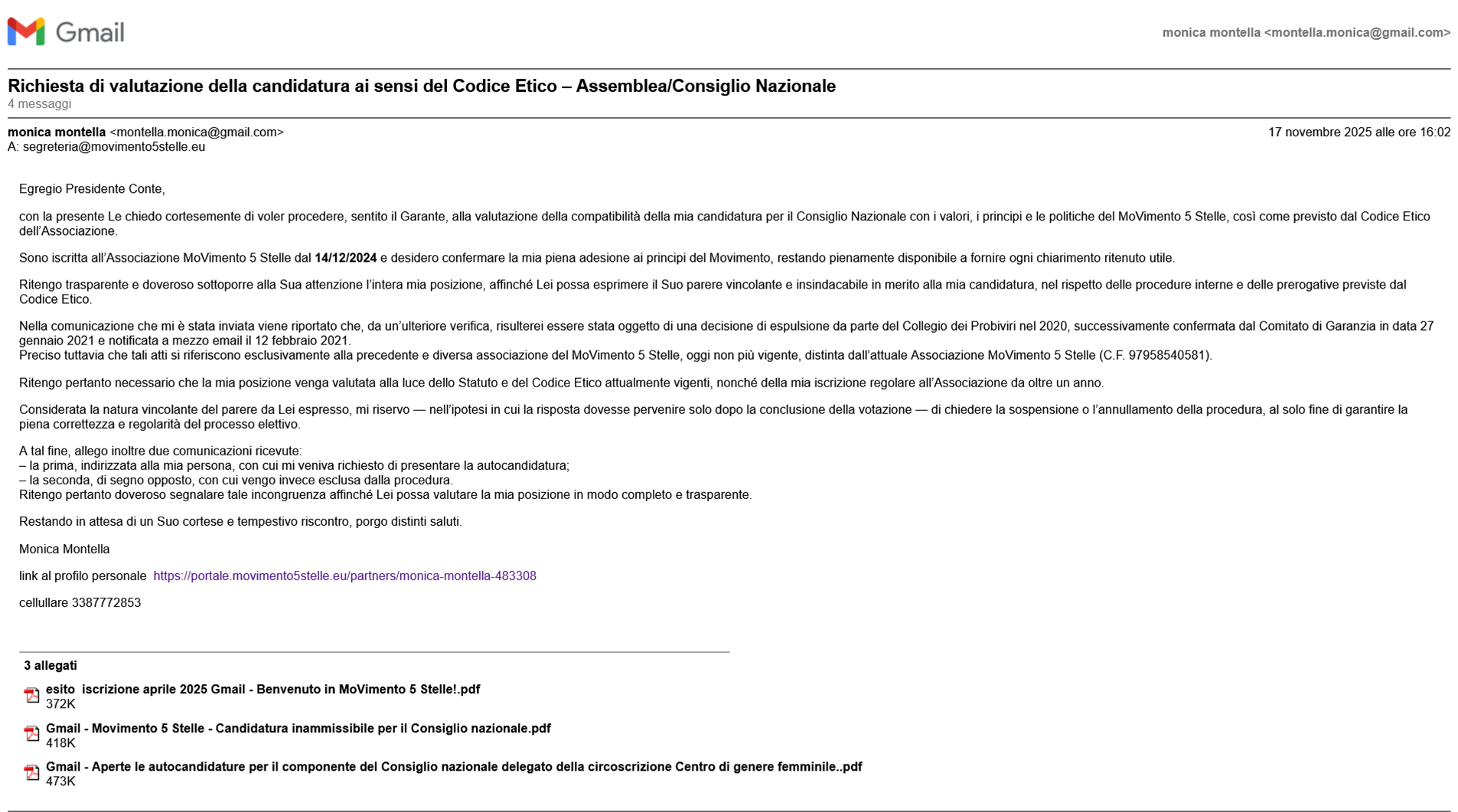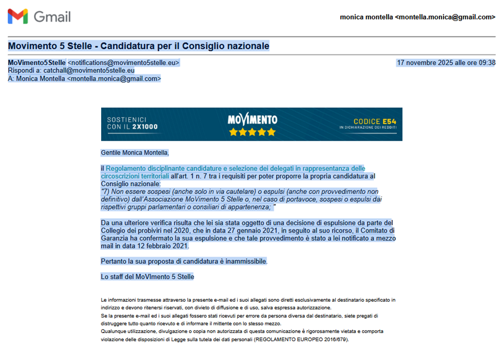 Nella mia richiesta ho chiarito che i provvedimenti richiamati si riferiscono a una precedente e diversa associazione, oggi non più esistente, mentre io sono regolarmente iscritta all’attuale Movimento 5 Stelle dal 14 dicembre 2024. Ho chiesto una valutazione trasparente, allegando entrambe le comunicazioni ricevute per evidenziarne la contraddizione.